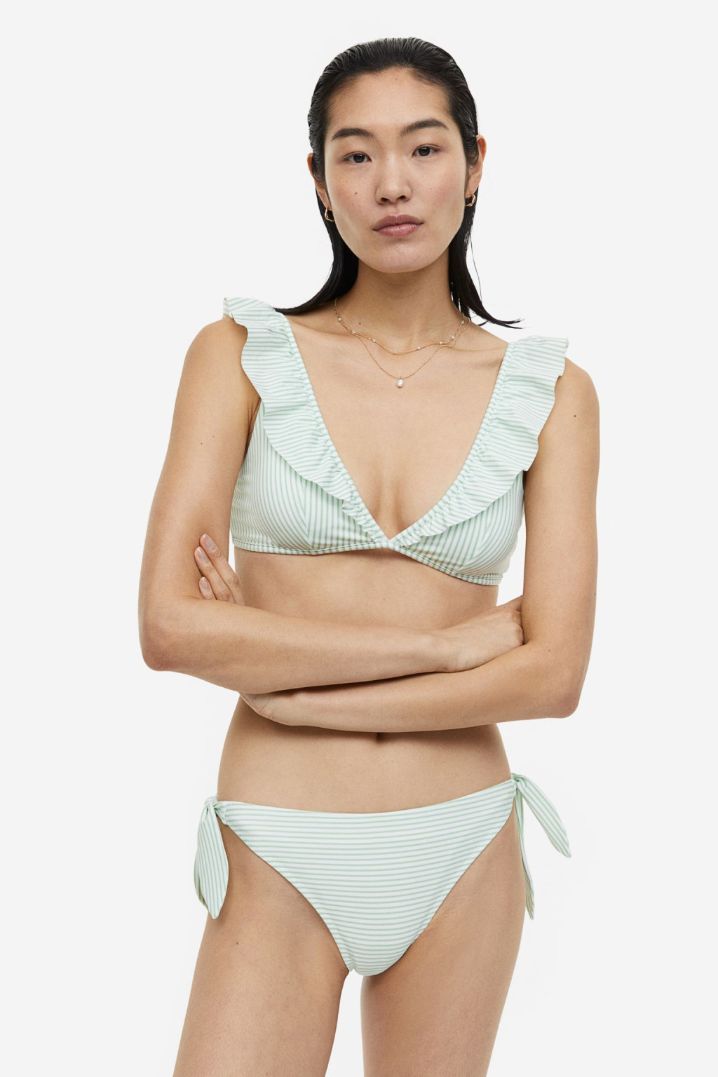 ▲條紋拼荷葉邊比基尼上衣/HK$149及高衩綁結(jié)泳褲/HK$99/H&M。
