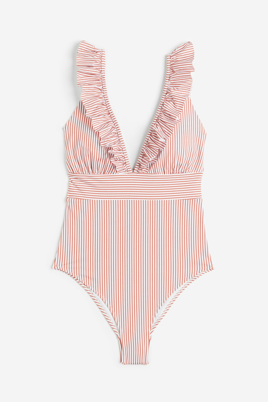 ▲粉紅色條紋拼荷葉邊Deep V泳衣/HK$249/H&M。