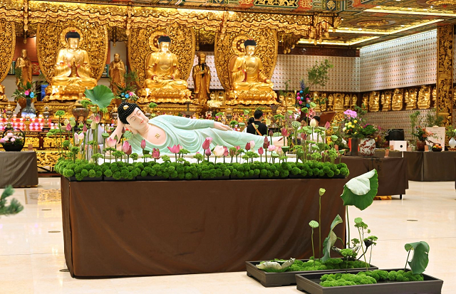 眾所周知,蓮花是佛教經(jīng)典和佛教藝術(shù)的象征物,為了弘揚佛學和中國傳統(tǒng)花藝文化、茶道文化,寶蓮禪寺特別請來臺灣的花藝大師和茶禪大師,連同50位來自世界各地的插花團隊,在萬佛寶殿舉行以佛經(jīng)“蓮華三喻”作主題的花藝茶席展。