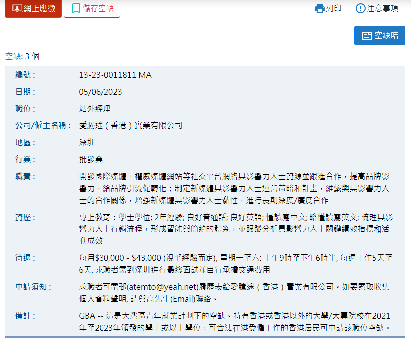 港府今年3月起恒常化“大灣區(qū)青年就業(yè)計劃”,參與的企業(yè)須按照香港法例,以不低于月薪18,000港元,聘請合資格畢業(yè)生,并派駐他們到大灣區(qū)內(nèi)地城市工作。記者嘗試瀏覽該就業(yè)計劃的網(wǎng)頁,發(fā)現(xiàn)有不少筍工,例如一間批發(fā)業(yè)公司聘請的深圳站外經(jīng)理,月薪可達43,000港元,只要有2年工作經(jīng)驗、持學士學位就可申請;亦有深圳采購公司聘請會計師,薪酬最高可達60,000港元;另有創(chuàng)科公司招聘研發(fā)工程師職位,學歷要求學士學位,月薪達24,000港元。至于18,000港元的工作,就各行各業(yè)都涵蓋,例如公關(guān)主任、助理工程師,以及銀行業(yè)務(wù)員等。