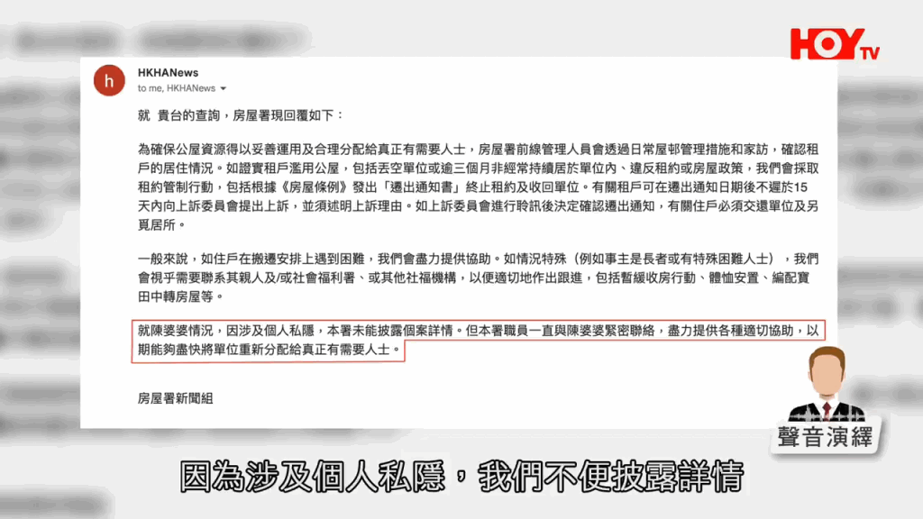 房屋署表示,因涉及個人私隱,署方未能披露個案詳情。