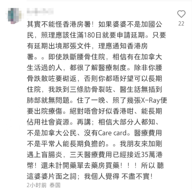 2.陳婆婆是否真的常住香港?有網(wǎng)友根據(jù)陳婆婆加拿大護(hù)照無出入境記錄、在醫(yī)療制度嚴(yán)格的加拿大住院許久等信息,分析認(rèn)為陳婆婆很可能已經(jīng)加入加拿大戶籍或拿了綠卡,因此護(hù)照上沒有出入境記錄,且很可能不是常住香港。網(wǎng)友紛紛認(rèn)為阿婆占用公共資源,公屋應(yīng)該給其他更需要的人。