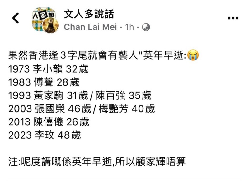回顧過去半世紀的香港娛樂圈,每隔10年都有星光殞落,而且全都是在3字尾的年份離開,由1973年逝世的李小龍、1983年的傅聲、1993年的黃家駒與陳百強,以至到2003年的張國榮與梅艷芳,全部都轟動全城,更曾被指逢3字尾都年份就是娛圈的“大兇年”,而李玟的死訊又再次令這個魔咒成為熱話。