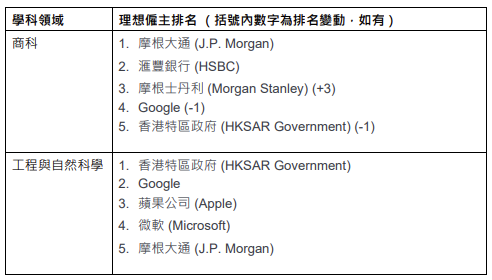而工程與自然科學(xué)學(xué)生的行業(yè)選擇方面,首選五個(gè)行業(yè)分別是教育(23%)、藝文及康樂(lè)(22%)、電腦軟件及科技(22%)、銀行業(yè)(22%)以及資訊科技及工程顧問(wèn)(20%),首三位理想雇主分別為香港特區(qū)政府、Google及蘋果公司。