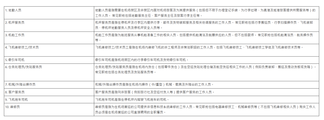 計劃涵蓋以下10種前線非管理級機(jī)場員工﹕地勤人員;機(jī)坪服務(wù)員;機(jī)艙工作員;飛機(jī)維修技工/技術(shù)員;牽引車司機(jī);倉務(wù)處理員/貨站服務(wù)員;機(jī)械/升降臺操作員;客戶服務(wù)員;飛機(jī)拖車司機(jī);維修員。計劃招聘人員上限為6300人。
