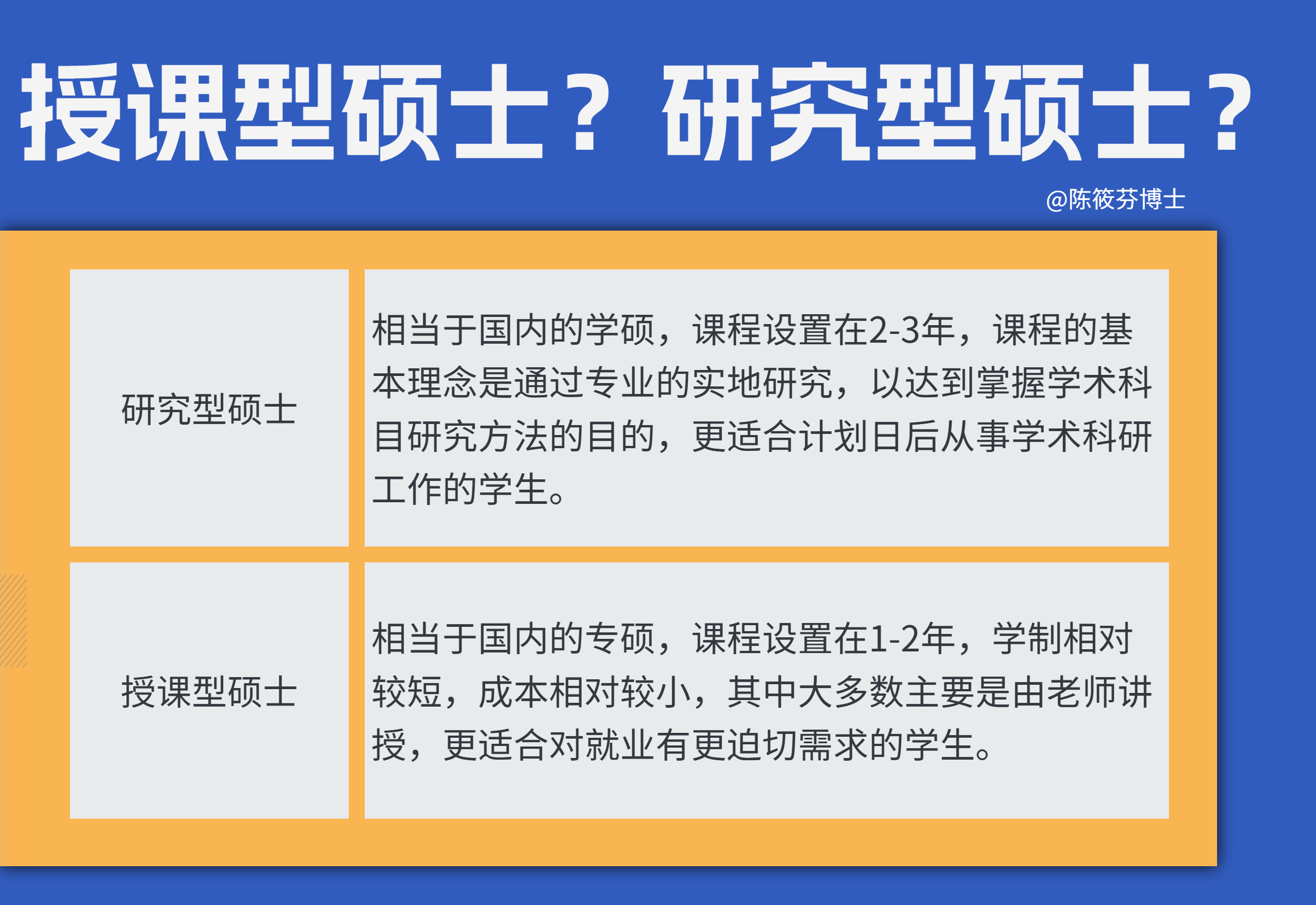 研究型碩士與授課型碩士的區(qū)別就在于此,前者以培養(yǎng)學(xué)術(shù)研究人才為核心,注重學(xué)科理論與專業(yè)方向的深入鉆研,后者則更偏向?qū)嵺`性,目的是幫助學(xué)生更快獲得更好的市場就業(yè)機(jī)會。如果你的目標(biāo)只是為了獲得一份更高的學(xué)歷,為日后就業(yè)加分,那么授課型碩士以就業(yè)為導(dǎo)向的課程設(shè)置顯然更為合適。
