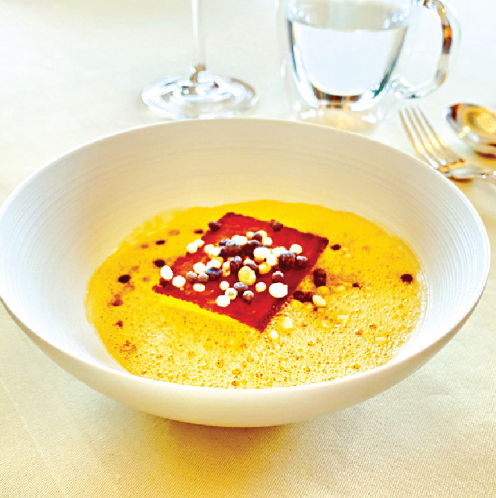 下一道菜Turbot, Capres et Sapin,沿用線釣比目魚入饌,肉質(zhì)緊緻味道淡雅,還增添線釣魚穫獨(dú)特的鮮甜,佐以微酸的小酸豆及柑橘魚子醬,以及香滑而附果仁香氣的朝鮮薊汁提鮮。接下來的招牌Biscuit de Saint Jacques,沿用鮮甜而肉質(zhì)豐厚的北海道帆立貝入饌,并將之化身帶子蓉,佐以輕盈細(xì)滑而Foamy的檸檬香蜂草汁,風(fēng)味獨(dú)特。