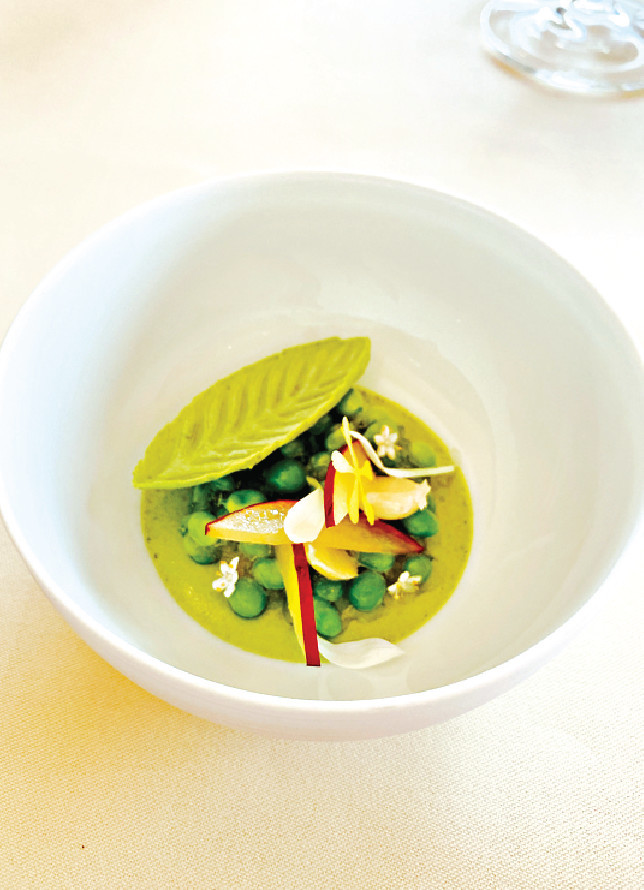 是日四手聯(lián)乘主廚盛宴($1,288/位),Amuse Bouche餐前小食二重奏,Biscuit Sapin Champignons Noisette以咸味冷杉餅乾和菇菌外層,配合榛子和忌廉夾心,精緻樸實(shí)而香氣樸鼻;眼前綠色的一口Herb Focaccia意大利麵包,質(zhì)感厚實(shí)柔軟,田園風(fēng)味四溢。接下來如畫般意境的是豌豆三重奏,新鮮豌豆配底層豌豆泥,再伴以冷凍豌豆泥塑型樹葉,以鮮甜的豌豆締造清脆、爽口、細(xì)滑三重質(zhì)感。緊接下來的Champignons Sauvage jus fermente en sabayon comme une soleil,是Emmanuel Renault家鄉(xiāng)經(jīng)典菜香菇配千層酥的精緻版本,眼前薄透香脆的香菇芝士餅,隱藏著質(zhì)感輕盈的Sabayon蛋黃醬,以及底層的平菇和羊肚菌,香氣撲鼻而散發(fā)田園風(fēng)味。
