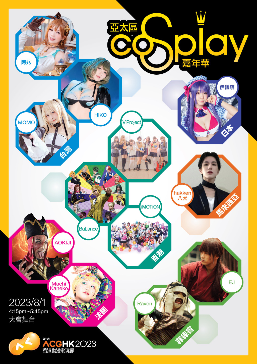 “亞太區(qū)Cosplay 嘉年華”將于動漫節(jié)最后一日舉行,多隊亞太區(qū)知名Cosplayer組合會參與演出,包括日本伊織萌、馬來西亞八犬、法國AOKIJI 及Machi Kaneko、臺灣MOMO、HIKO及阿兆、菲律賓 EJ & Raven、香港BaLance、V-Project及iMOTiON都將共聚一堂。