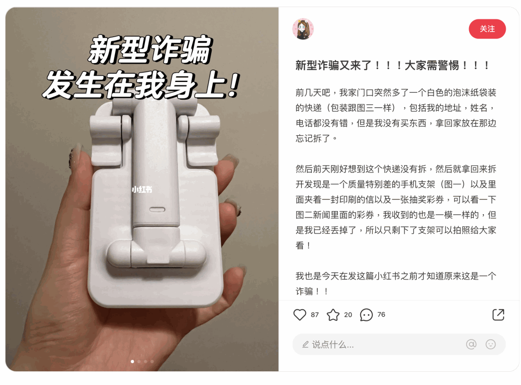近日有大量網(wǎng)民在內(nèi)地社交平臺(tái)“小紅書”分享,指自己離奇收到陌生人送來的速遞包裹,打開是一份小禮物,有的是手機(jī)支架,有的是水瓶水杯,亦有的是紙巾盒,全部都是實(shí)用的小物品。 同時(shí)包里會(huì)有一張刮刮樂抽獎(jiǎng)券,刮開后會(huì)聲稱已經(jīng)中獎(jiǎng),要求中獎(jiǎng)?wù)哙蕉S碼聯(lián)絡(luò)領(lǐng)獎(jiǎng)。 雖然速遞包裹里的小禮物的確是免費(fèi),但萬一掃了二維碼,就有機(jī)會(huì)被騙,有網(wǎng)民的親人更因此損失了40萬人民幣。