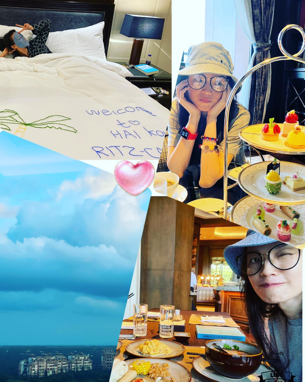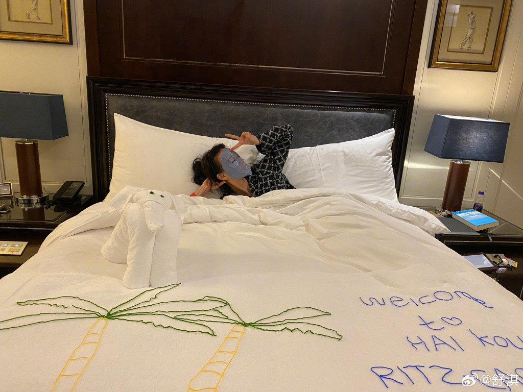 而舒淇未有提及與誰人撐枱腳,但開餐時見到眼鏡反射對面的人穿白色衫,估計其夫馮德倫。舒淇寫道:“好不容易放了個假,酒店1日游,吃飽喝足、睡覺,晚安安唷”。舒淇除嘆下午茶外,又在房內(nèi)打卡,她躺在布置好的床上,擺出多個姿勢,其中一張更是敷Mask相,完全放棄女神形象。