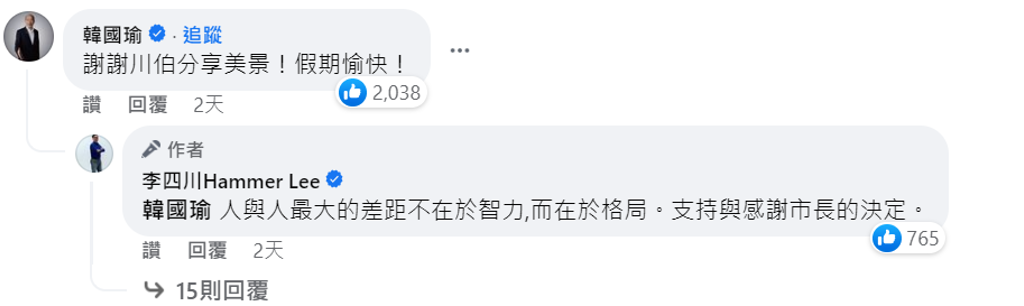 充滿意境的風(fēng)景,不但吸引大量網(wǎng)友來按贊留言,時(shí)常跟老同事互動(dòng)的韓國瑜也驚喜現(xiàn)身,大夸“謝謝川伯分享美景!假期愉快!”。而李四川的回文卻相當(dāng)驚人,“人與人最大的差距不在于智力,而在于格局,支持與感謝市長的決定?!币l(fā)網(wǎng)友熱議。