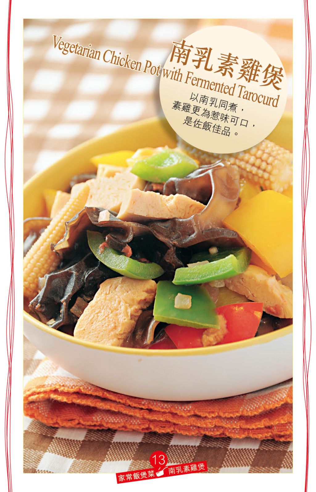傳統(tǒng)中式素菜多用南乳作調(diào)味,用電飯煲烹調(diào)這道“南乳素雞煲”,同樣惹味香濃,秘訣是先爆香南乳,再加入蔬菜炒勻及下調(diào)味料煮熟即可,另外糖是必備調(diào)味料,可以中和南乳咸味及提升鮮香。