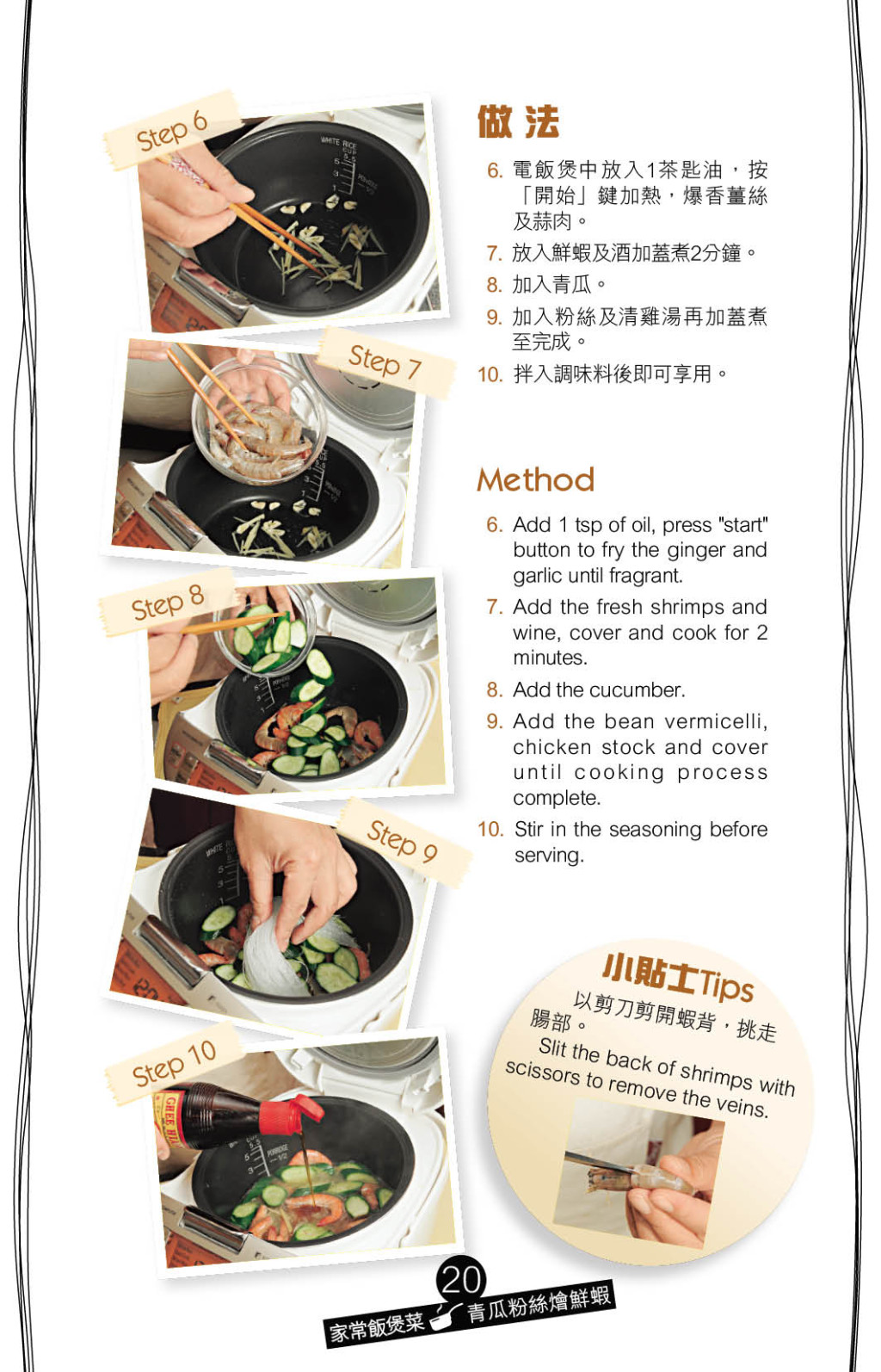用電飯煲煮“青瓜粉絲燴鮮蝦”,選游水海蝦或冰鮮蝦均可,質(zhì)感同樣爽脆,加入姜片及紹興酒可去除蝦腥味,粉絲吸了蝦鮮味及調(diào)味料的香氣,十分美味。