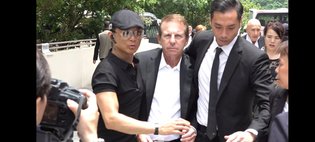 火化儀式結(jié)束后,Bruce由幾名穿黑衫保安護(hù)送步出火葬場(chǎng)