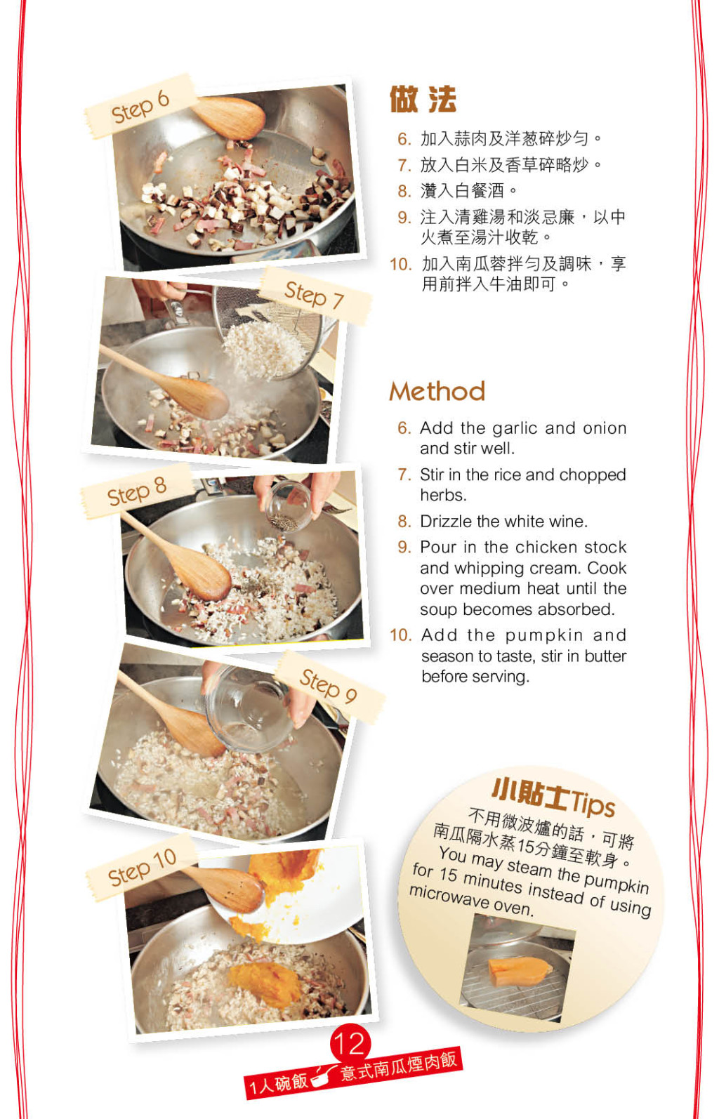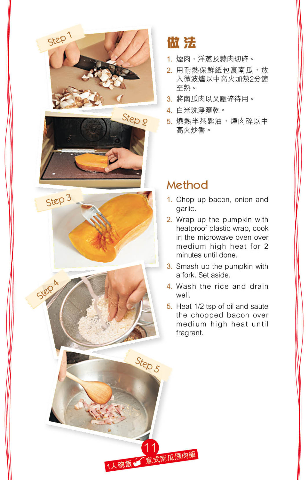 南瓜飯是常見有營美食,今日教煮的“意式南瓜煙肉飯”,改用白米取代意大利米,口感更清爽,先用微波爐加熱南瓜做成蓉,配料沿用意式風味,加入白酒、淡忌廉、煙肉、香草、牛油及清雞湯,最后味道豐富。