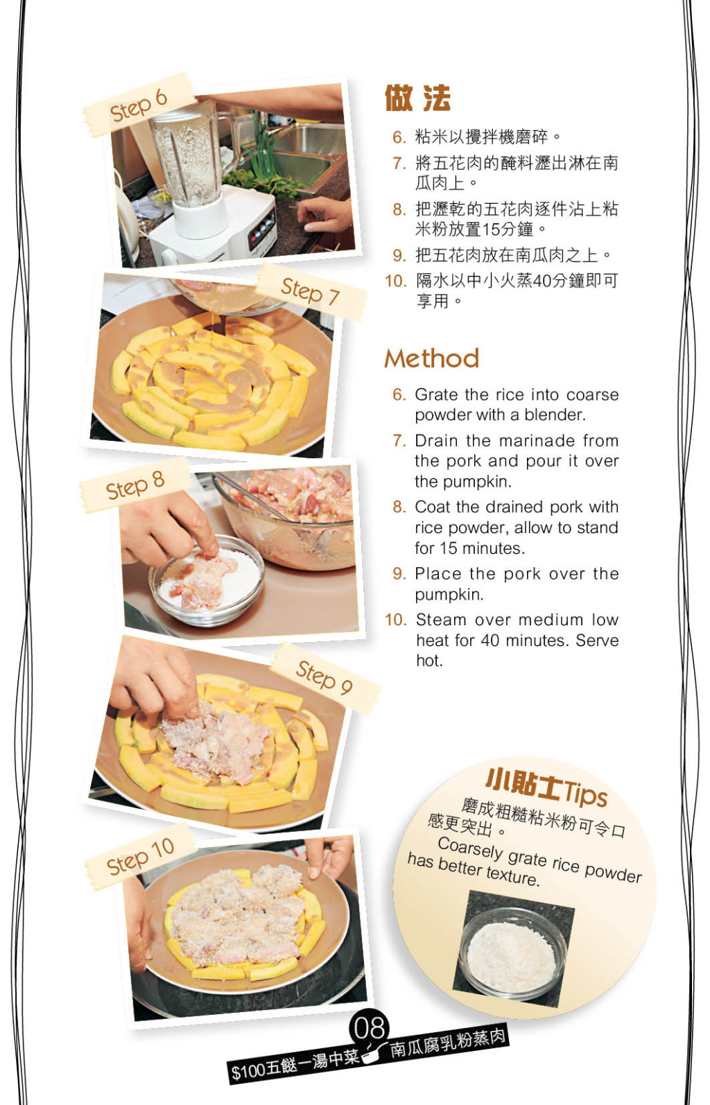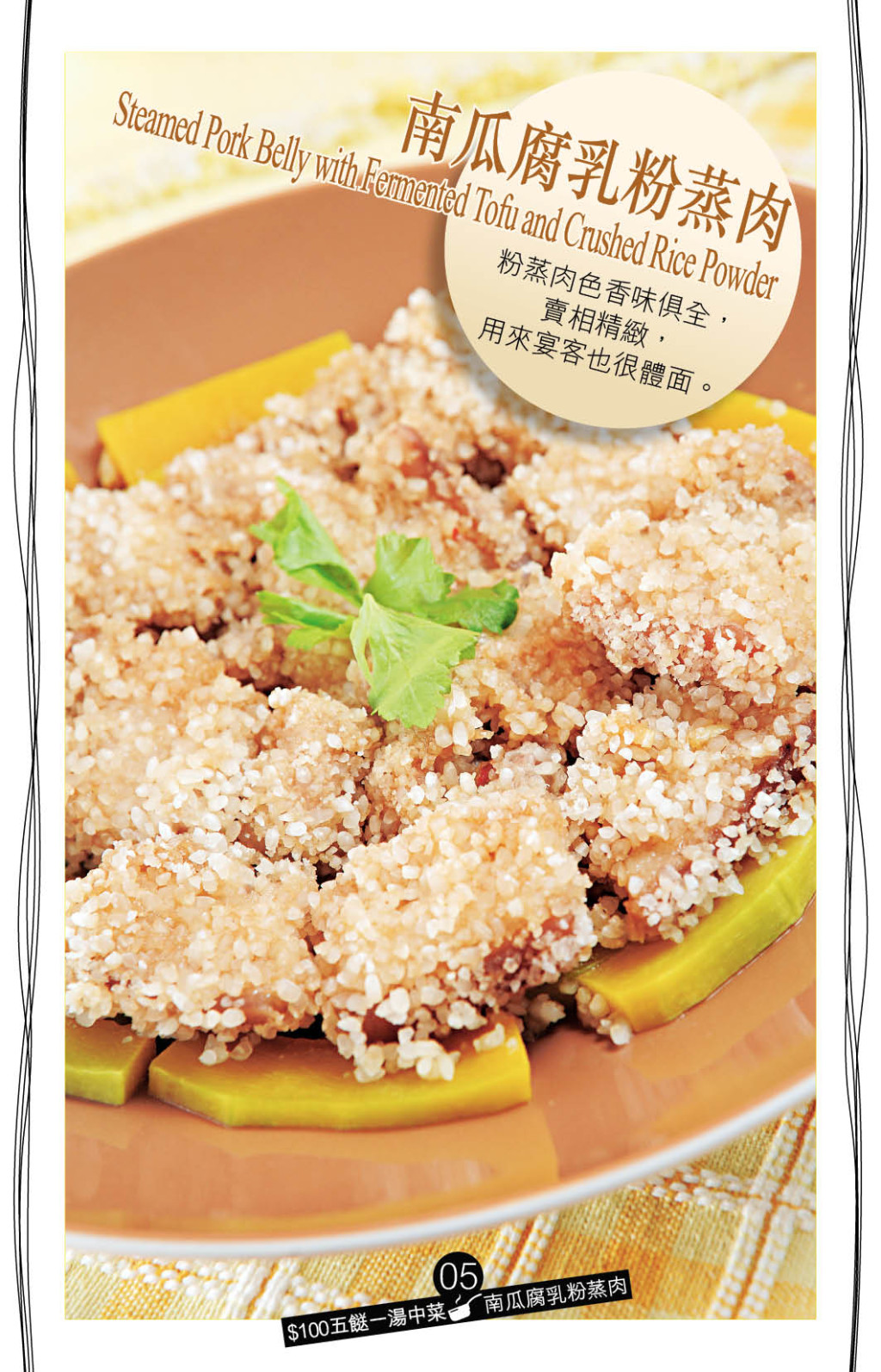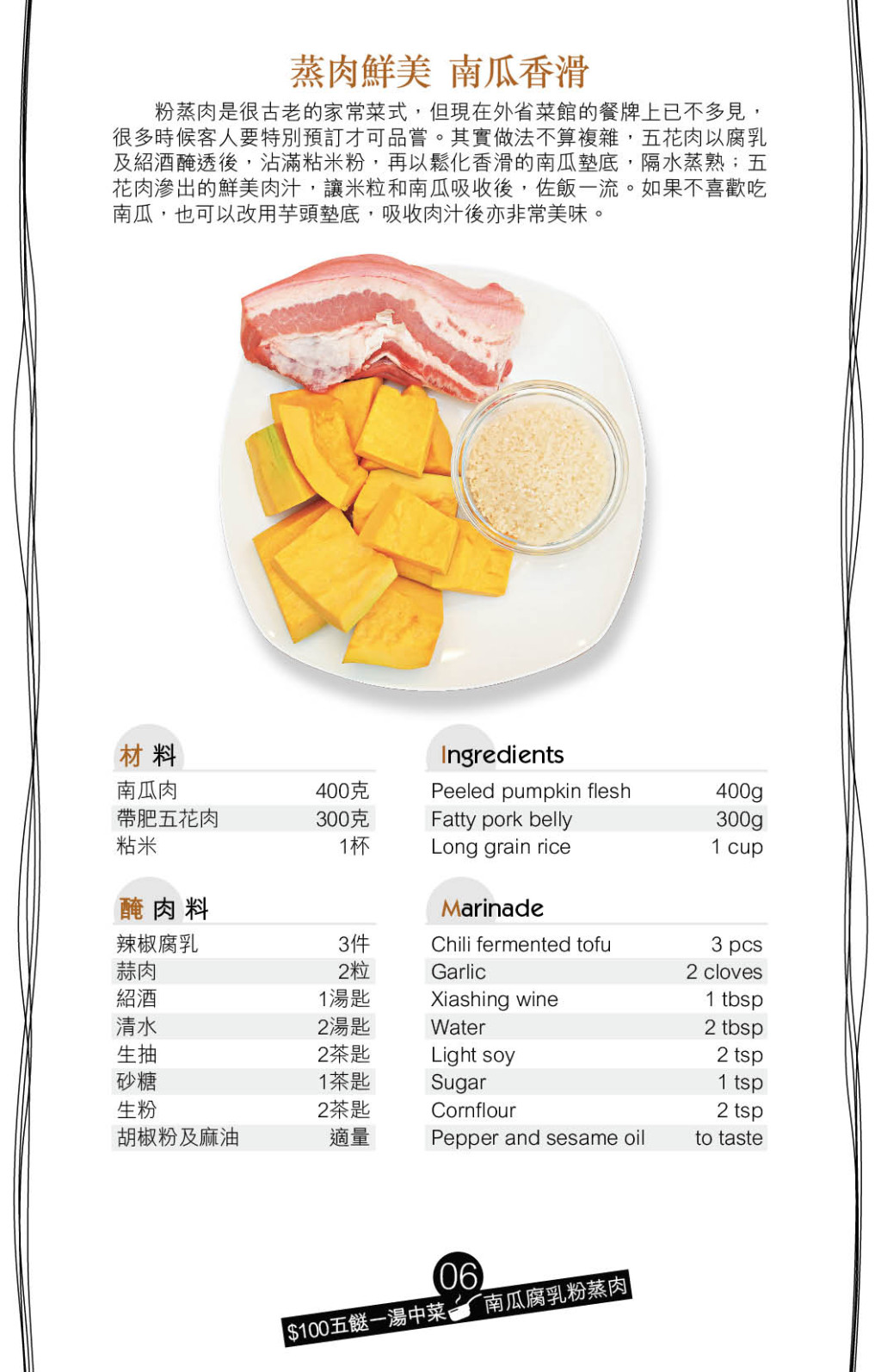 看似烹法復雜的“南瓜腐乳粉蒸肉”,其實也可輕易做到。用腐乳及紹酒腌透五花肉,以攪拌機磨碎粘米,將腌好的五花肉沾滿粘米,在碟上鋪上南瓜片墊底,放上五花肉蒸熟,南瓜吸收了肉汁,特別惹味。
