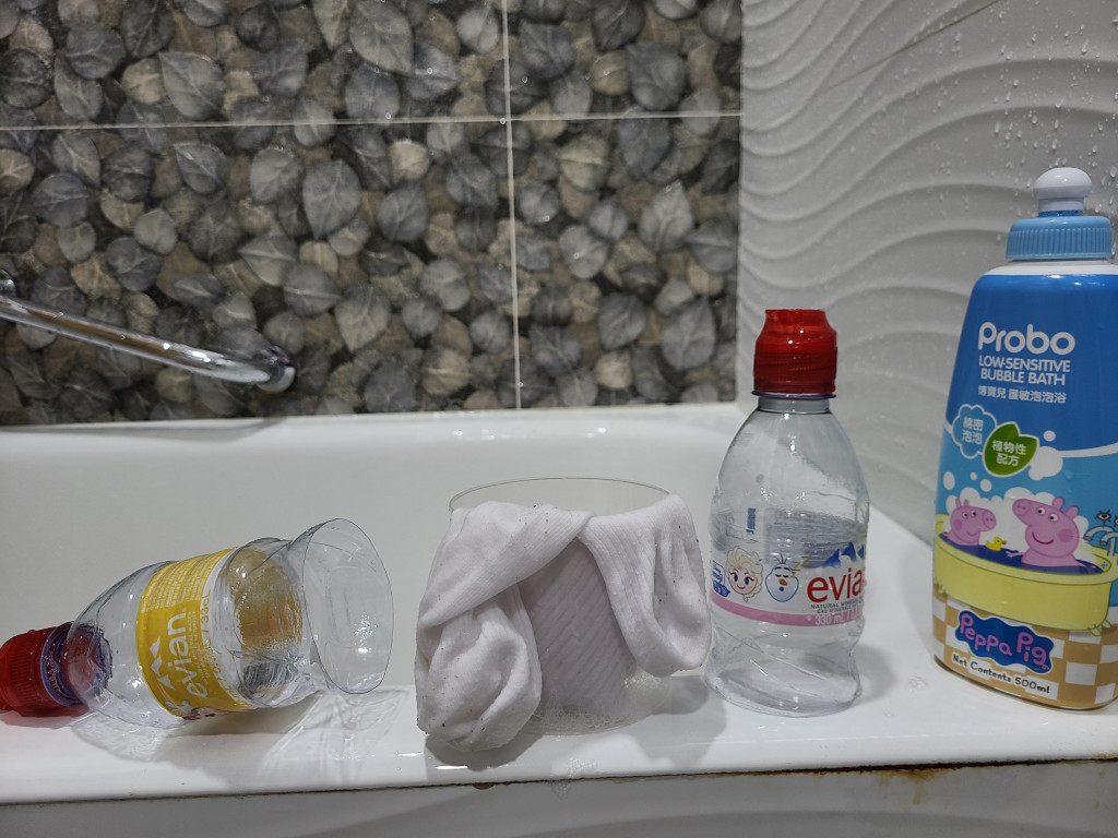 材料和工具:膠樽、襪子、洗潔精、剪刀、小盆、水