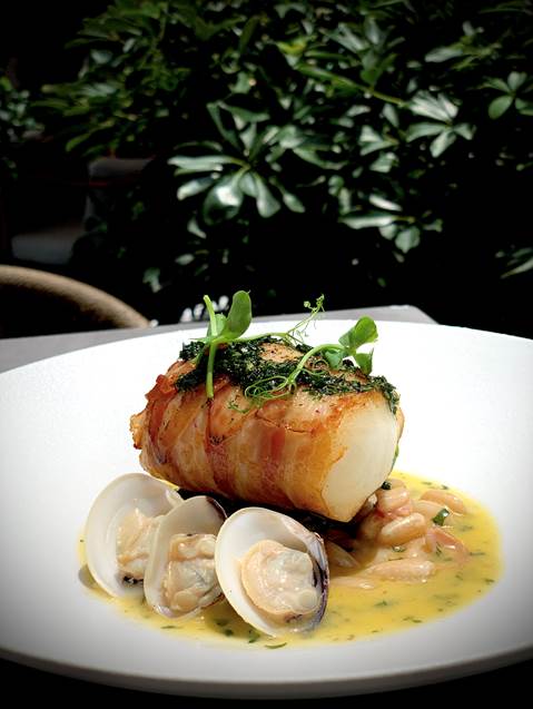 主菜:烤阿根廷牛柳(大虎蝦、薯蓉、菠菜、紅酒汁) 或 煙肉裹鱈魚(燴白豆、蜆、蘆筍、意式香草)