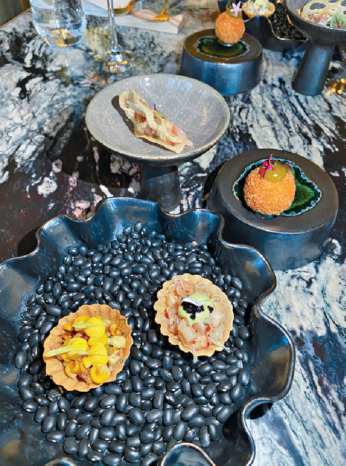 沿走當(dāng)代泰式Fine Dining的菜館裝潢簡(jiǎn)約時(shí)尚、實(shí)而不華。這夜四道菜嘗味晚餐($1,080/位),先送上Amuse Bouche餐前小食四重奏,自身淡甜細(xì)膩的Hamachi油甘魚(yú)碎先經(jīng)龍眼木煙薰,增添甜甜的果香和煙熏香氣,用時(shí)佐以隨附的Renkon Chip蓮根脆片添香脆; Taro Puff芋頭泡芙內(nèi)裹芋頭蓉和椰菜,香口惹味而散發(fā)咖喱辛香; 迷你玉米撻整體口感爽甜而附椰香; 一口甜蝦撻味道甜酸,清新醒胃。