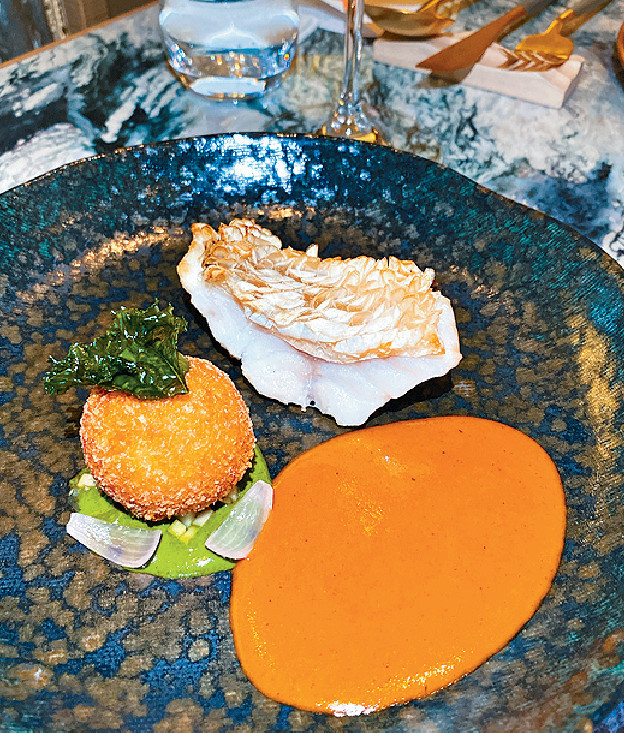 接著的第二道菜,提供Amadai甘鯛或松葉蟹供選擇,甘鯛自身肉質(zhì)鮮美稠密,配合經(jīng)油泡炸煮至片片高聳、口感香脆的魚(yú)鱗,用時(shí)醮上少許Choo Chee Curry紅咖喱添香辣; 隨附的配菜炸免治豬肉蝦球,分別以羽衣甘藍(lán)慕絲、羽衣甘藍(lán)莖粒、羽衣甘藍(lán)葉、羽衣甘藍(lán)干襯托,以羽衣甘藍(lán)的四重風(fēng)味,提升炸物的味道口感,同時(shí)食材盡用,識(shí)食惜食。