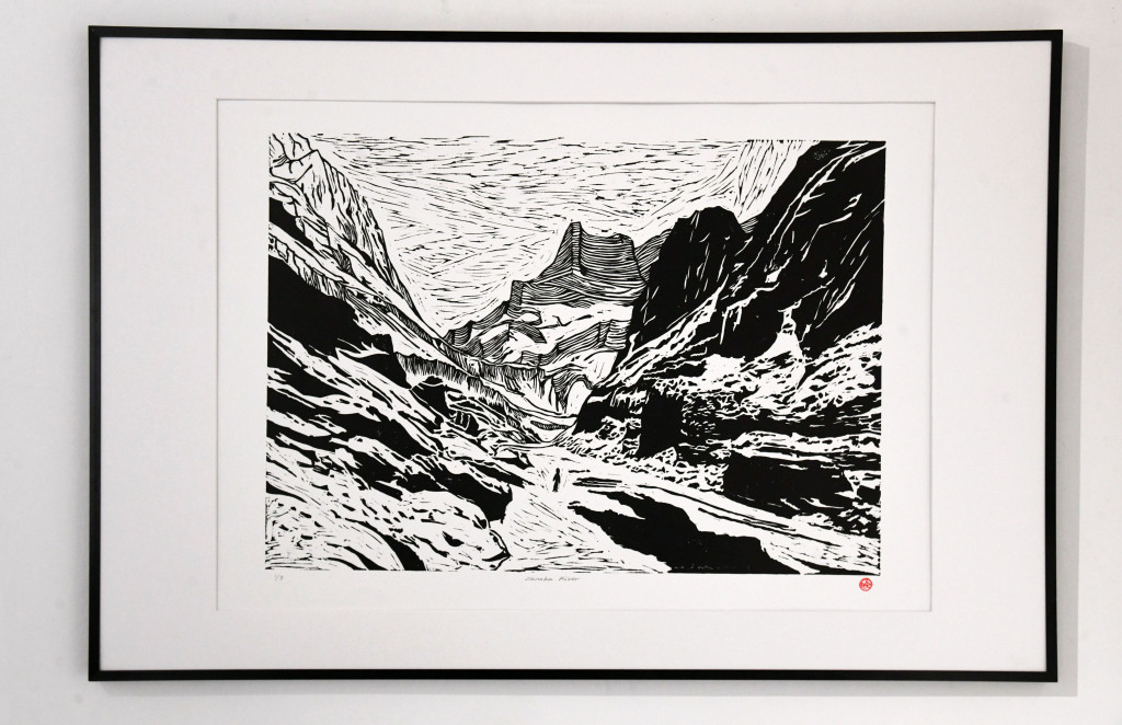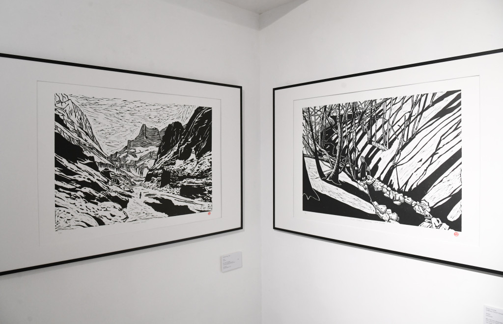 至于Cowrice的靈魂人物Philip和Grace,不但是嘉欣的好朋友,原來(lái)他們跟阿揚(yáng)亦早已相識(shí),更曾是鄰居。談及版畫(huà)跟照片的呼應(yīng),Grace便為今次特別創(chuàng)作的三幅大型版畫(huà)作解說(shuō)。她指三幅作品好比詮釋著過(guò)去、現(xiàn)在與未來(lái),當(dāng)中呈現(xiàn)出一份微妙的聯(lián)系,就像一道源頭在北印度的河流,流經(jīng)不同地域,把他們?cè)?jīng)生活的香港,以及當(dāng)下生活的英國(guó)連結(jié)起來(lái)。第一幅畫(huà)作是把阿揚(yáng)的一幅冰川的攝影作品制作成版畫(huà),第二幅作品則勾畫(huà)了Grace跟女兒在英國(guó)的時(shí)候,經(jīng)常會(huì)行經(jīng)居所附近河畔的情景。第三幅作品則描繪在香港行山時(shí)所見(jiàn)的景貌。