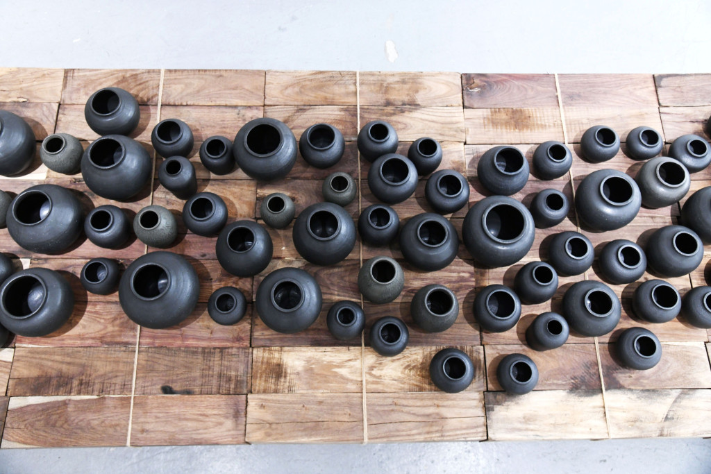 ▲林嘉欣以一百件黑陶器皿,拼合成3米乘1米的裝置作品,猶像一道小河流。