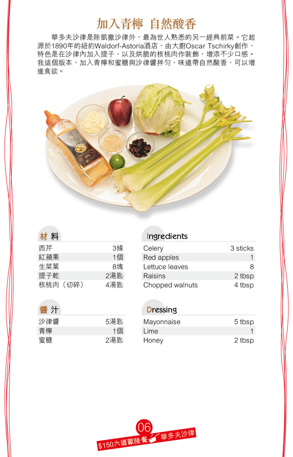 清爽沙律是西餐必備前菜,好像爽口的經(jīng)典前菜“華多夫沙律”,源自1890年的紐約Waldorf-Astoria酒店,由大廚Oscar Tschirky創(chuàng)作,除了生菜、西芹、蘋果等蔬果外,更加入提子干、烘脆核桃肉增加口感,沙律醬汁則拌入青檸汁及蜜糖添清新香甜味。