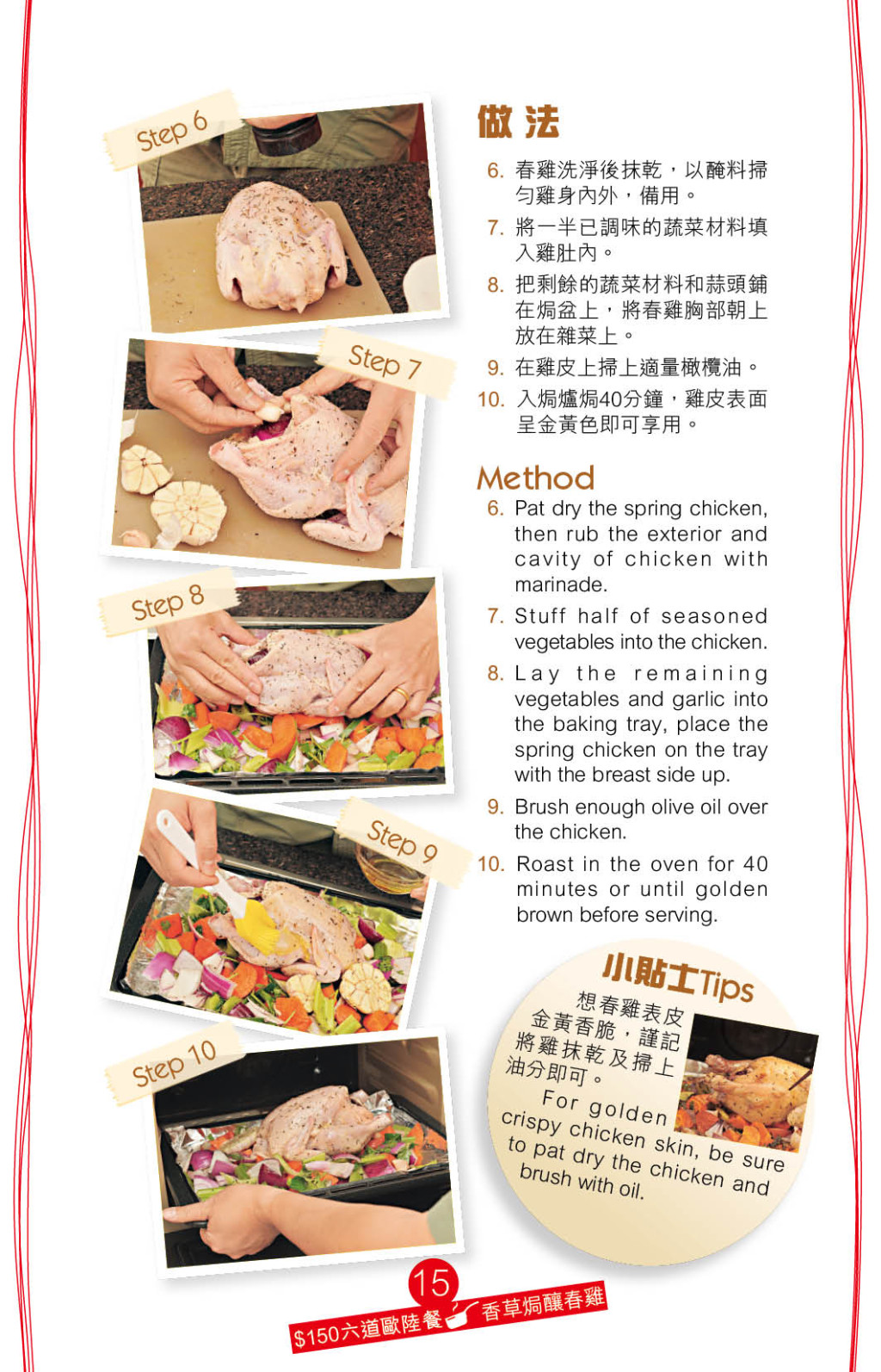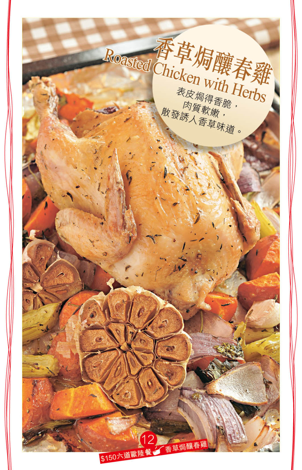 主菜“香草焗釀春雞”的配料豐富,包括原個蒜頭、甘筍、西芹、紅洋蔥、芫荽、青蒜,將所有蔬菜切件,加入香草碎、橄欖油、香草、鹽及胡椒調(diào)味后,一半釀入春雞內(nèi),另一半放在焗盤,再放上春雞焗至金黃熟透,蔬菜吸收春雞的精華,味道更鮮美。