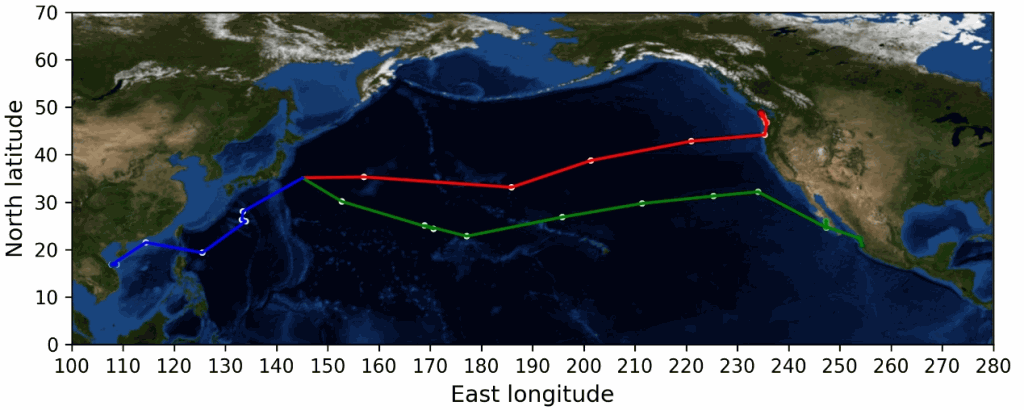 除宏觀擴散外,研究人員還從微觀角度進行了氚的擴散模擬。與宏觀擴散分析注重污染物的整體分布不同,微觀擴散分析更加關注污染物個體的行為,也因此它能夠支持污染物的擴散路徑分析。例如,對模擬結果中到達沿岸海域的某三個污染物微粒,以400天為取樣間隔,得到它們的運動軌跡?;谶@些運動軌跡,可以知道美洲沿岸海域的污染物主要通過橫跨太平洋到達。