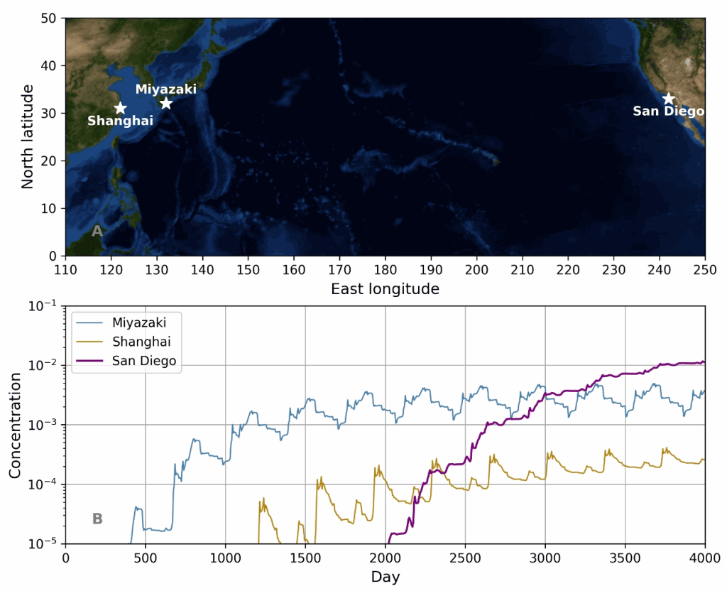 研究人員進一步選取了日本宮崎、中國上海和美國圣地亞哥這三個沿海城市進行對比,從污染物濃度變化曲線圖中可以發(fā)現(xiàn),在第4000天時圣地牙哥附近的污染物濃度大約為0.01個單位,這一數(shù)值已經(jīng)是宮崎的三倍左右、上海的40倍左右。出現(xiàn)這一現(xiàn)象的原因主要是日本附近強烈的洋流作用,福島處于日本暖流(向北)和千島寒流(向南)交匯的地方,所以大部分污染物不會沿著陸地邊緣向南北方向遷移,而是隨著北太平洋暖流向東擴散。這一結果也意味著,在核廢水排放的早期,應主要考慮它對亞洲沿岸的影響。但在后期,由于北美沿岸海域的污染物濃度將持續(xù)高于大部分東亞沿岸海域,需要重點關注北美沿岸海域的受影響情況。