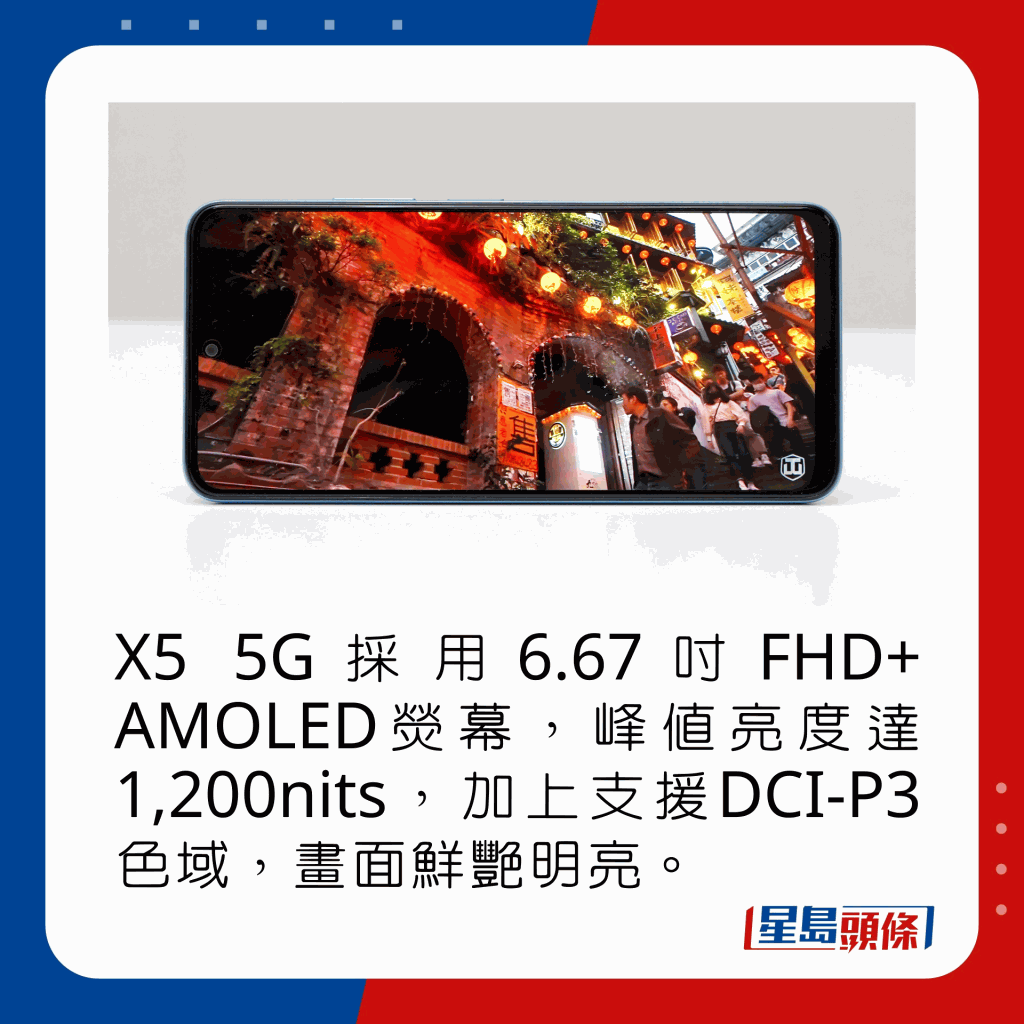 小米旗下POCO向來以高性價比作招徠,這款Android入門5G手機X5 5G也不例外,售價不用HK$2,000,不但用上支援120Hz更新率的6.67吋FHD AMOLED熒幕(解像度2,400×1,080),且擁有1,200nits峰值亮度,處理器也是性能較佳的S695 5G,加上內(nèi)置最高8GB RAM,效能也是5款推介中最好。影拍方面,X5 5G裝有48MP廣角主鏡、8MP超廣角及2MP微距,前置鏡頭為13MP,成像質(zhì)素及格。值得一提的是,X5 5G機身除了找到3.5mm耳機插口,還保留紅外線埠,可充當萬能遙控。