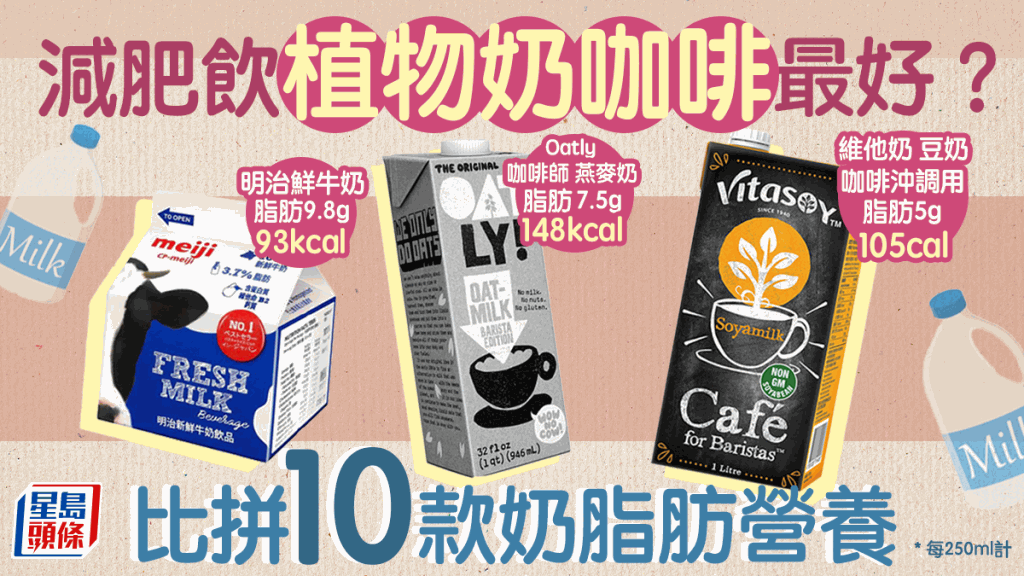 飲咖啡時選擇植物奶就不易致肥?到底選擇牛奶、燕麥奶、杏仁奶還是豆奶好?“尚營坊”營養(yǎng)師團(tuán)隊為愛喝咖啡人士分析哪些屬較健康的選擇,比較10款咖啡沖調(diào)奶的脂肪、卡路里、鈣質(zhì)等營養(yǎng)成分,當(dāng)中包括市面常見品牌“Oatly”、“維他”和“明治”的沖調(diào)奶。