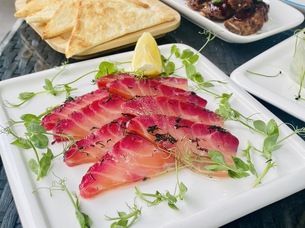 市中心內(nèi)街廣場的The Conservatory美食風(fēng)格清新,Panfried Chilli Garlic Prawns($118)富西班牙蒜椒蝦的影子,微辣而香氣十足。Ceviche of Tuna($116),南美風(fēng)味吞拿魚先經(jīng)檸檬汁、洋蔥、香菜醃漬,再配合蘋果木煙燻,增添淡淡果甜。接下來是即叫即串的Chicken Skewer ($98),特大雞肉烤串以源自非洲的Peri Peri醬汁提味,香辣惹味,且散發(fā)香草和煙燻香氣。