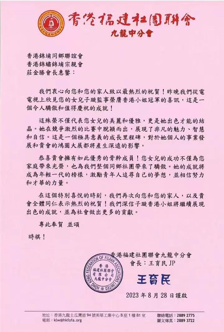 香港福建社團(tuán)聯(lián)會(huì)九龍中分會(huì)祝賀莊子璇奪港姐冠軍。