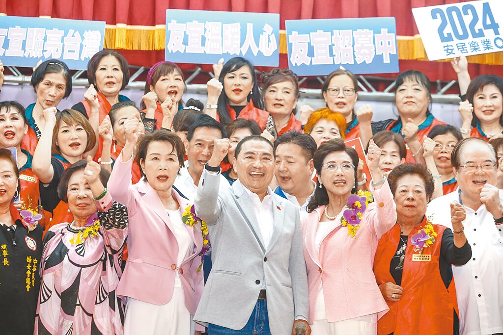 ▲國民黨2024參選人侯友宜(中)1日出席新北市“婦女會”第24、25屆理事長交接典禮暨挺侯市長選2024后援會成立大會。