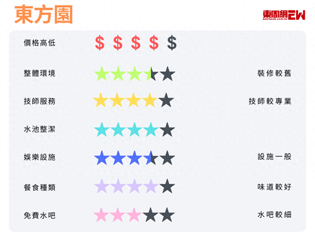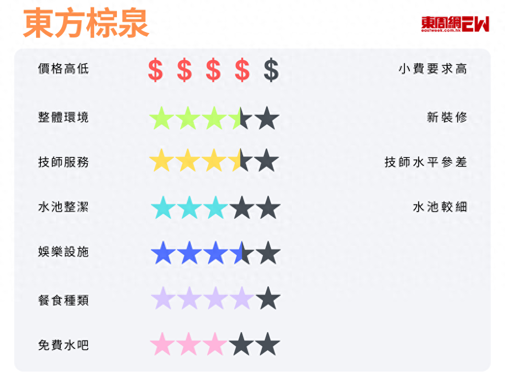 從價(jià)格高低、整體環(huán)境、技師服務(wù)、水池整潔、娛樂(lè)設(shè)施、餐食種類、免費(fèi)水吧七大方面評(píng)分!看看哪家性價(jià)比最高!