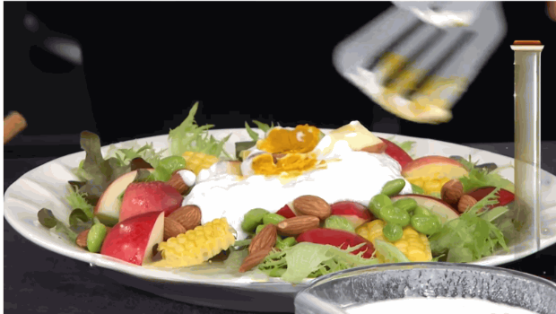 混和粟米、生菜、蘋果連皮、枝豆、堅(jiān)果后,加適量乳酪,最后撒上少許姜黃粉,即可食用。