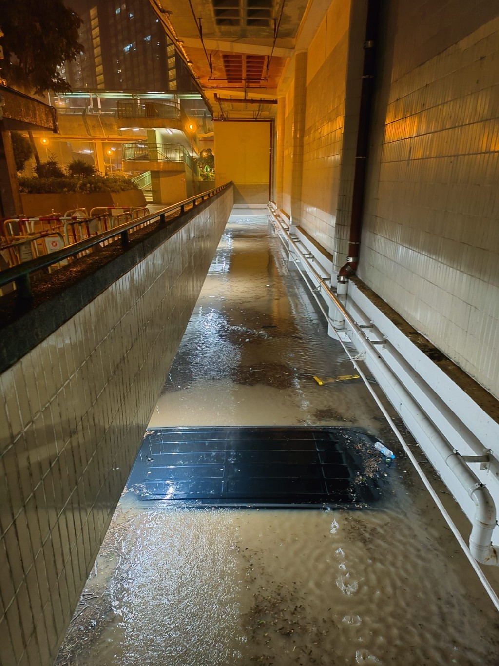 除了停車場嚴(yán)重水浸,柴灣多條馬路亦淪為澤國,環(huán)翠道某段路面有一大塊瀝青石屎更被雨水沖了出來。