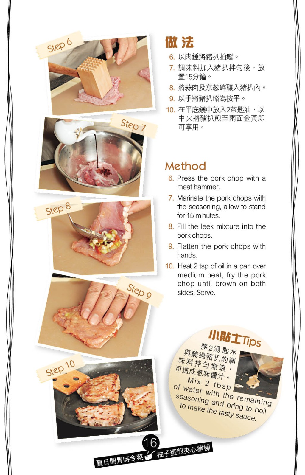 先將豬柳打橫切開(kāi)造成袋狀,用松肉槌將豬扒捶松,加調(diào)味料腌15分鐘,再釀入以京蔥碎、蒜肉及柚子蜜拌勻的醬料。