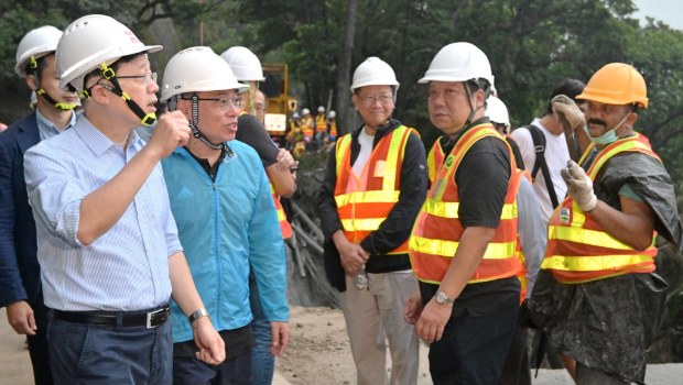 李家超(左一)和運(yùn)流局局長林世雄(左二)為路面修復(fù)工程的工作人員打氣。