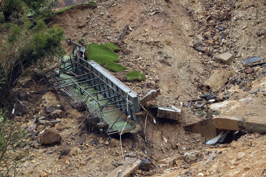 記者在場(chǎng)所見(jiàn),塌陷的山坡光禿禿,面積約20乘30米,殘留不少對(duì)象,包括護(hù)土墻、泳池鋁梯、人造草皮及水管等,山坡滿是碎石及黃泥,一路伸展至岸邊,沿途樹(shù)木被沖散及掩蓋。