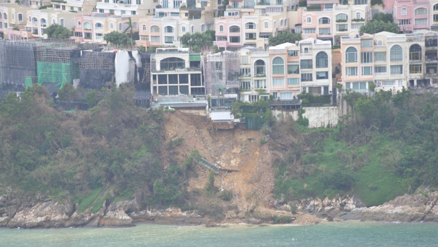 世紀暴雨令香港多區(qū)山泥傾瀉,其中在港島大潭豪宅屋苑紅山半島,三幢獨立屋受影響,其中72號獨立屋受影響地基懸空,沒有泥石支撐,部分石屎組件伸出山坡,被屋宇署指出有明顯危險,要求疏散有關(guān)占用人。而隔離的70號獨立屋也露出大幅地基,后花園幾乎消失,大面積崩塌。