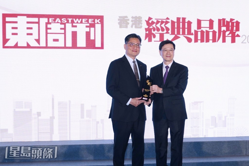 ▲特首李家超(右)頒發(fā)“百年經(jīng)典品牌”大獎(jiǎng)給“香港中華煤氣”,并由中華煤氣企業(yè)事務(wù)總監(jiān)楊松坤(左)代表領(lǐng)獎(jiǎng)。