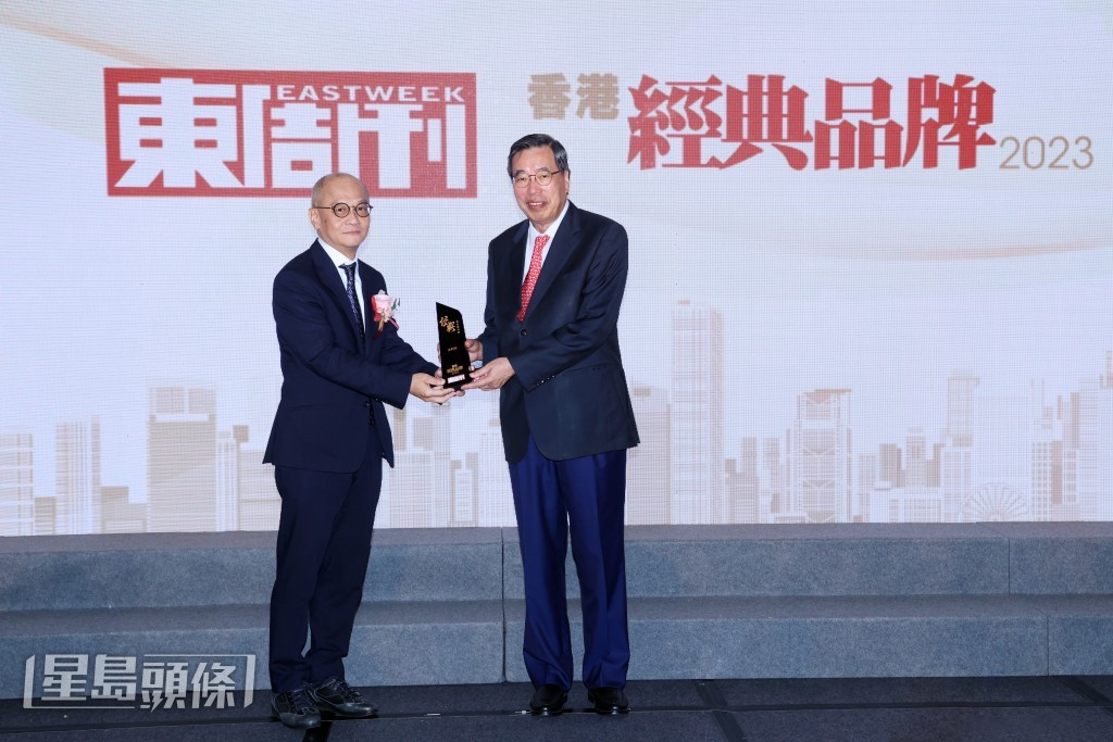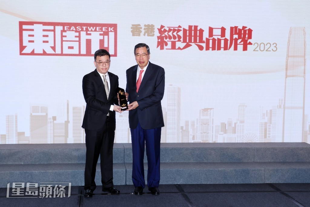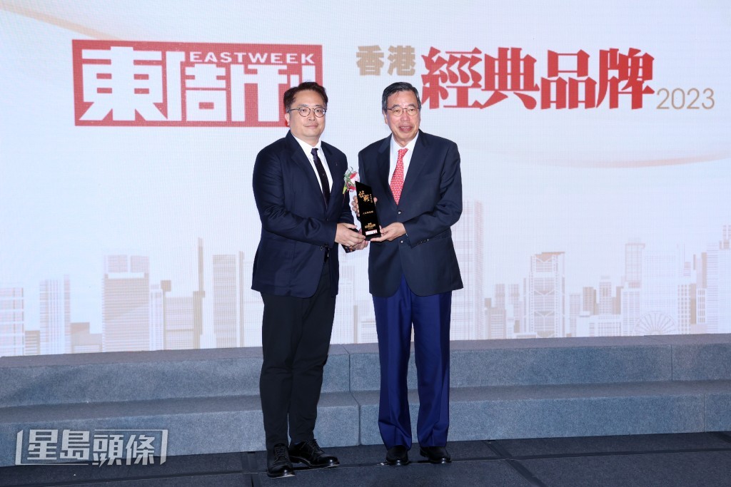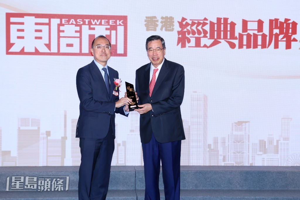 恒基兆業(yè)地產(chǎn)集團(tuán)獲頒「經(jīng)典品牌」,由主席辦公室顧問(wèn)于正人(左)代表領(lǐng)獎(jiǎng)。