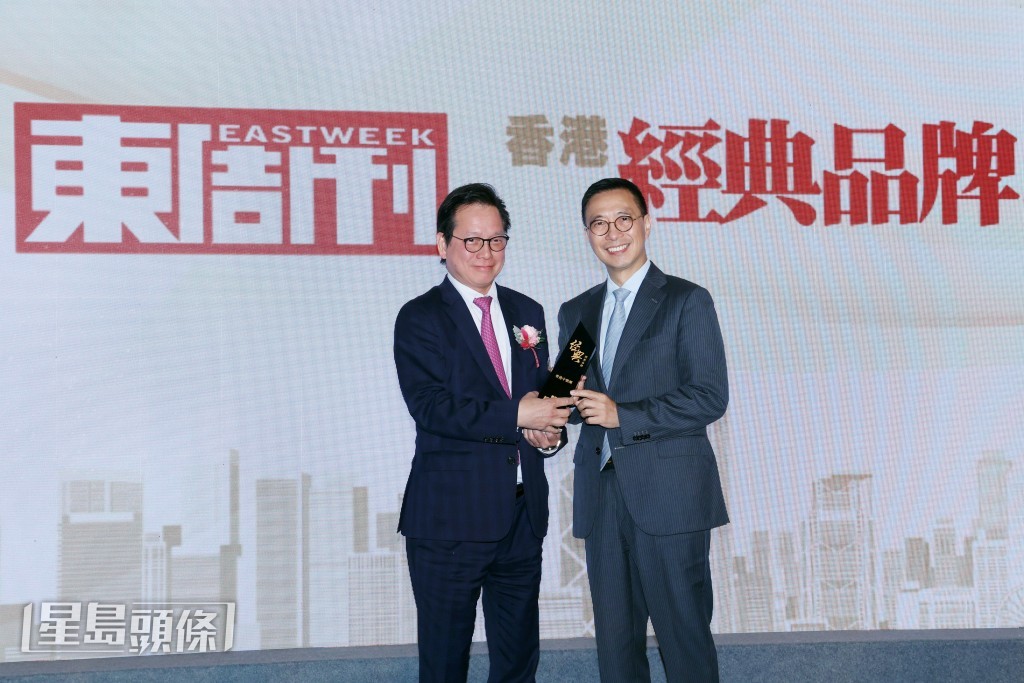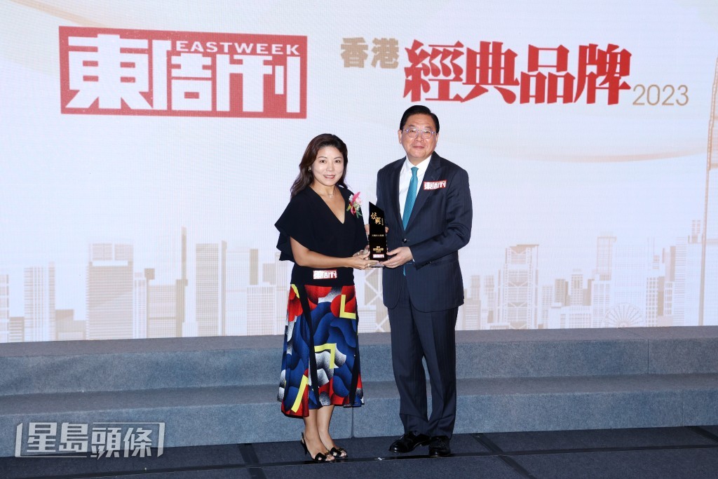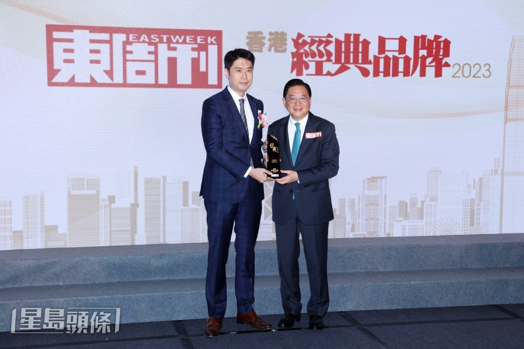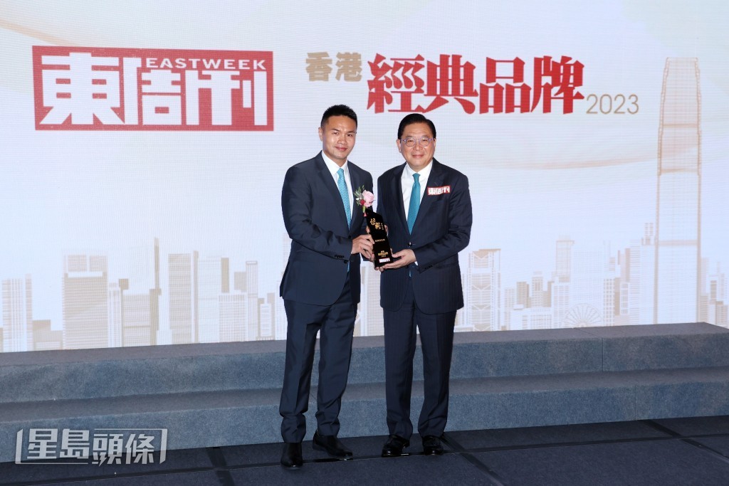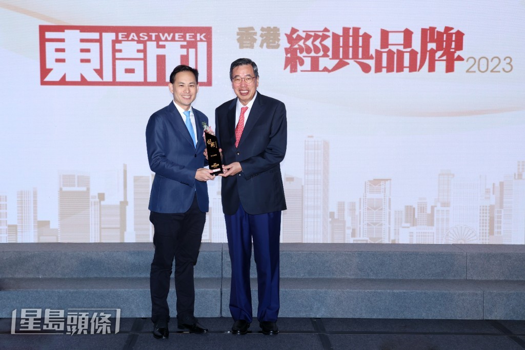恒基兆業(yè)地產(chǎn)集團(tuán)獲頒「經(jīng)典品牌」,由主席辦公室顧問(wèn)于正人(左)代表領(lǐng)獎(jiǎng)。