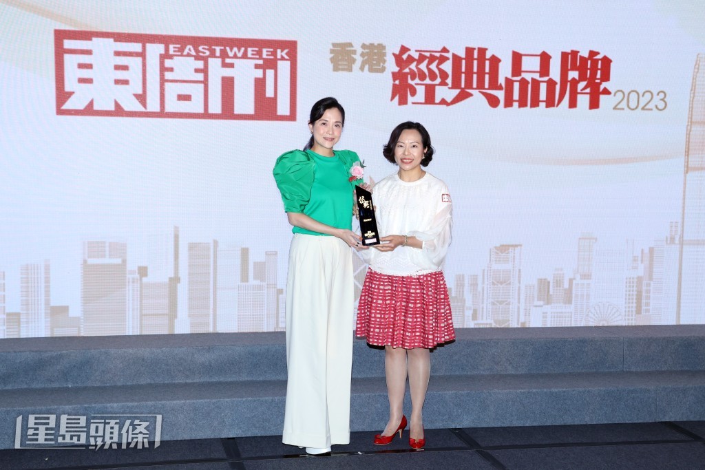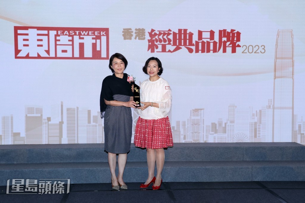 ▲鏞記酒家獲頒“殿堂級(jí)品牌”大獎(jiǎng),由財(cái)務(wù)總監(jiān)甘蕎因(左)上臺(tái)領(lǐng)獎(jiǎng)。