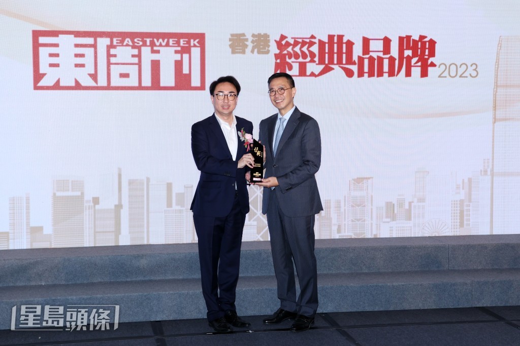 八達(dá)通卡有限公司獲頒「經(jīng)典品牌」大獎(jiǎng),由候任行政總應(yīng)天麒(左)代表領(lǐng)獎(jiǎng)。