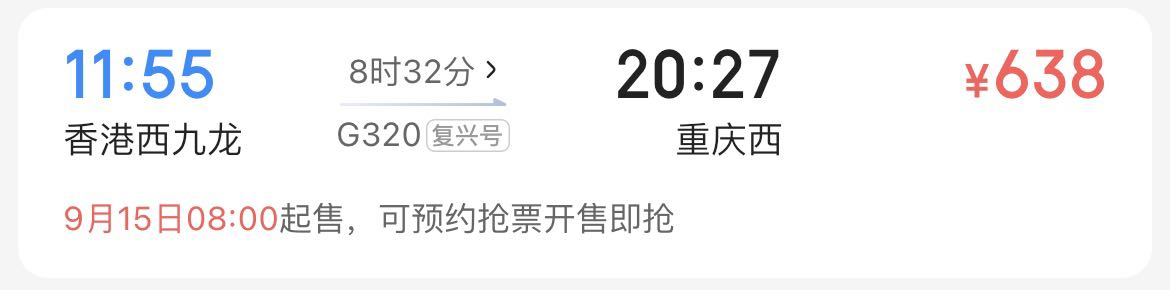 3、轉戰(zhàn)深圳/廣州坐高鐵去重慶:深圳票價497.5左右,廣州票價423左右,雖然車次多,但也要考慮國內十一搶票形勢嚴峻的問題!