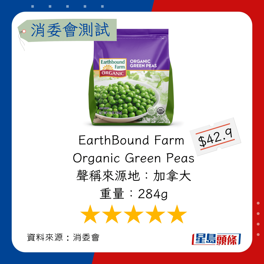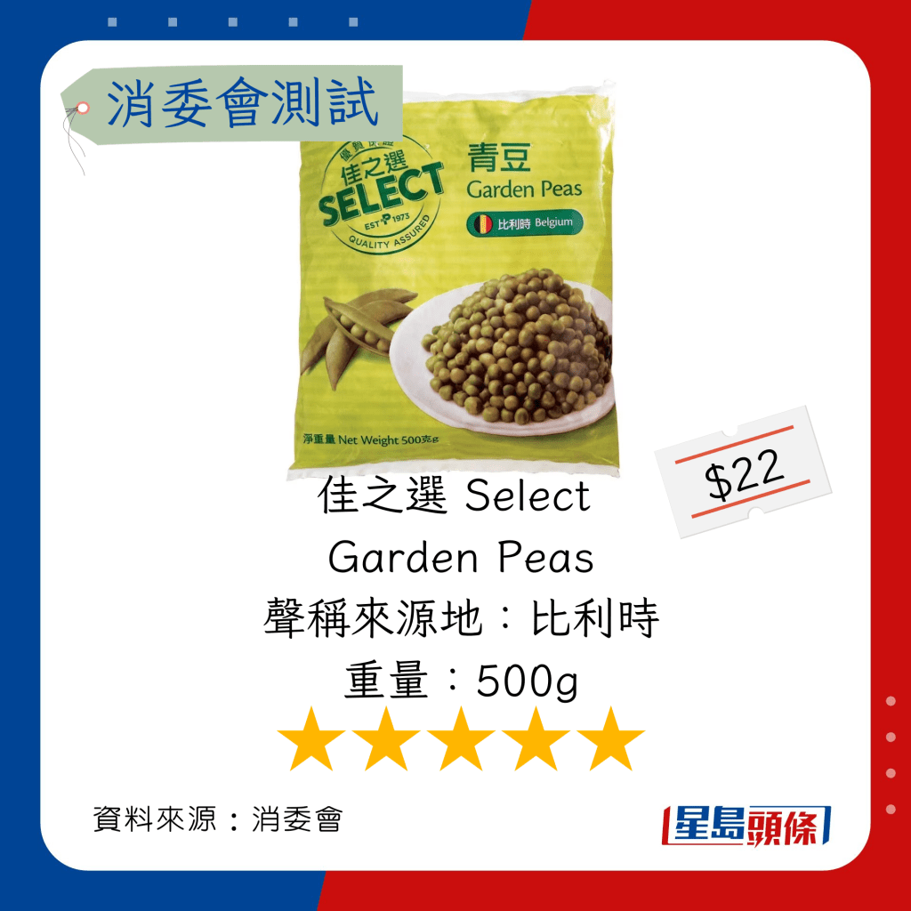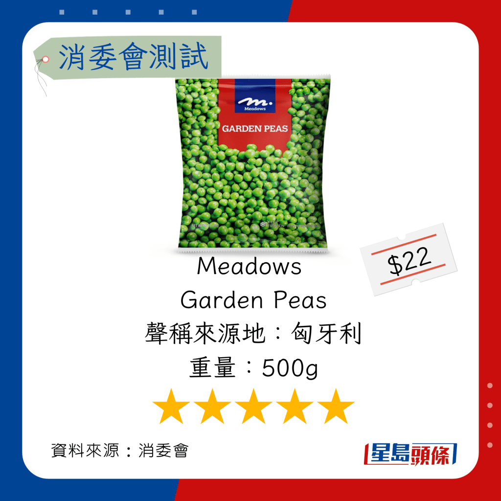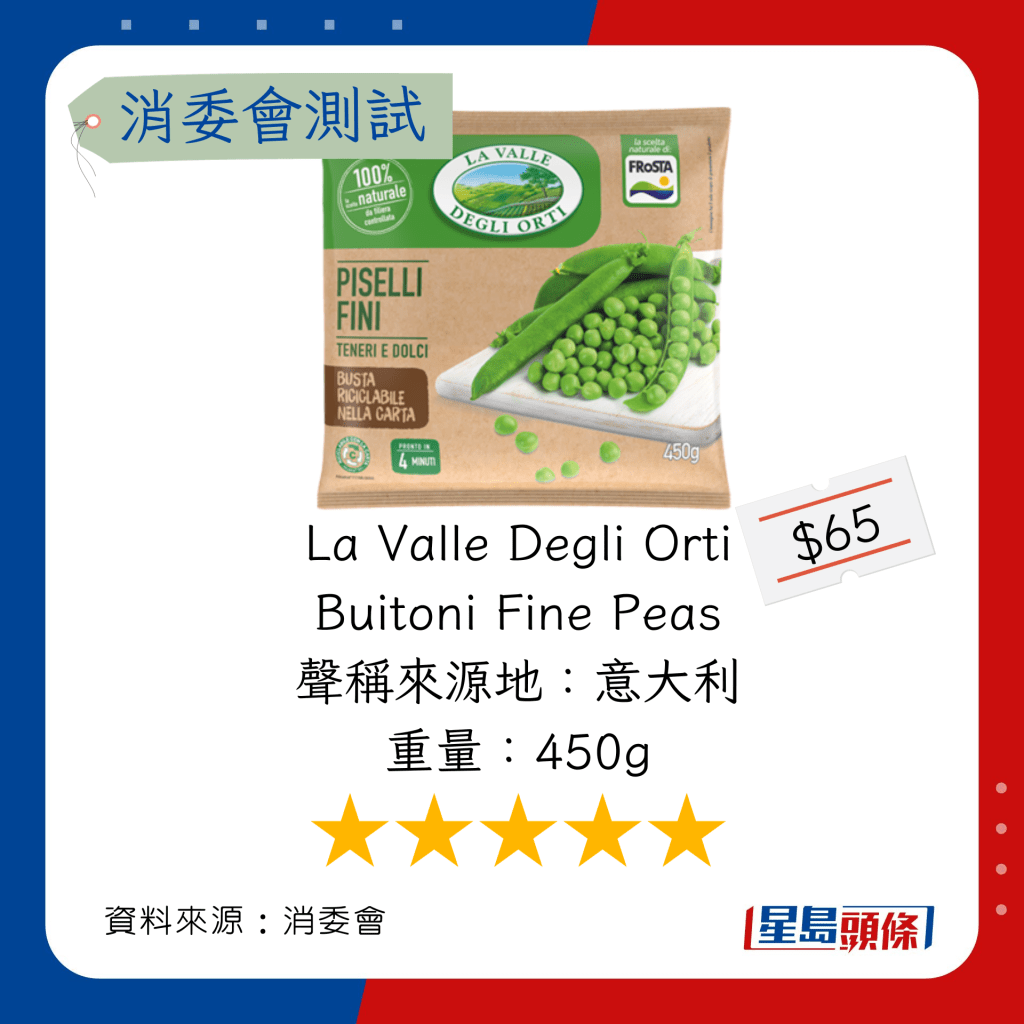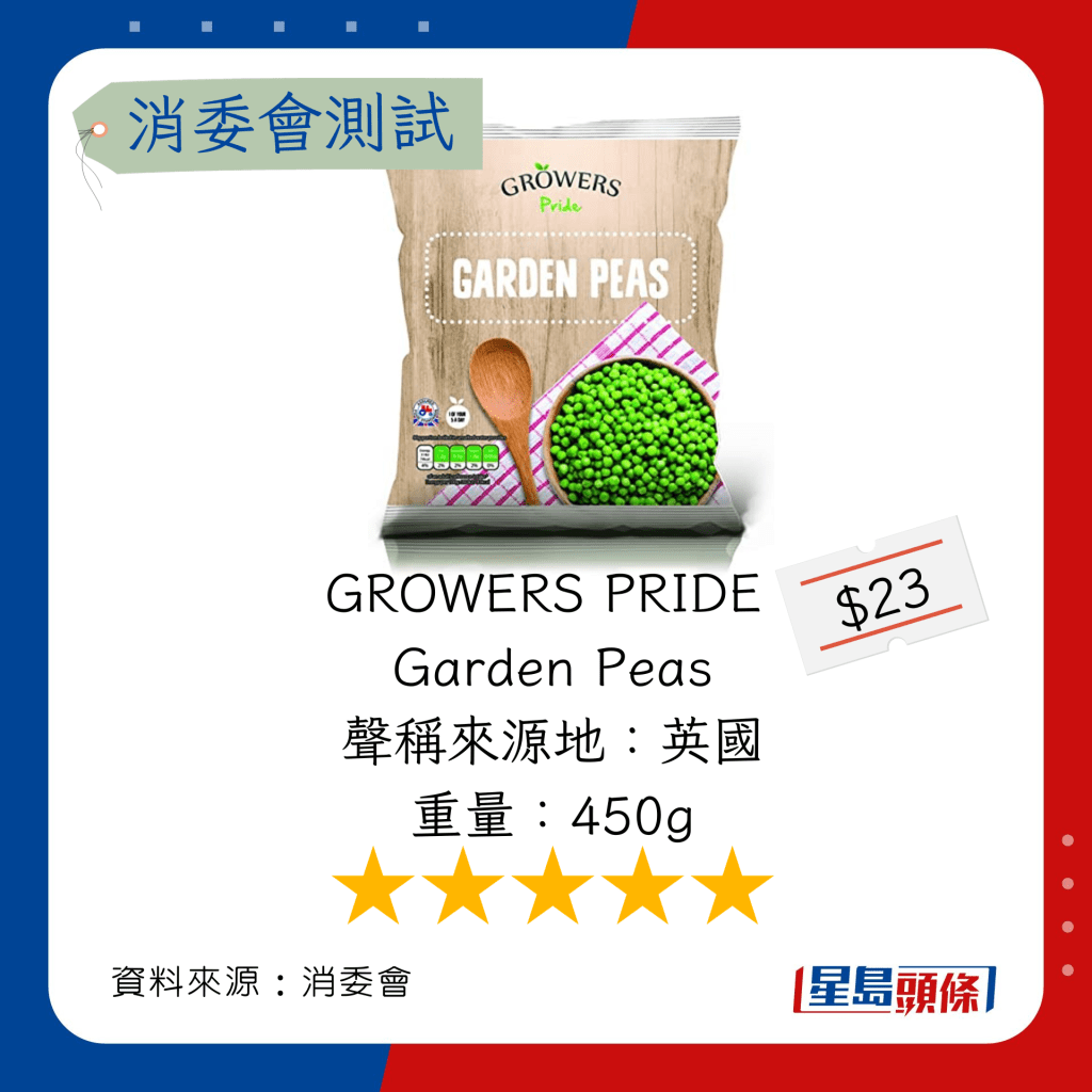 玉米粒及豌豆粒測試中,總評獲五星滿分名單如下,上榜的全是冷凍豌豆粒: